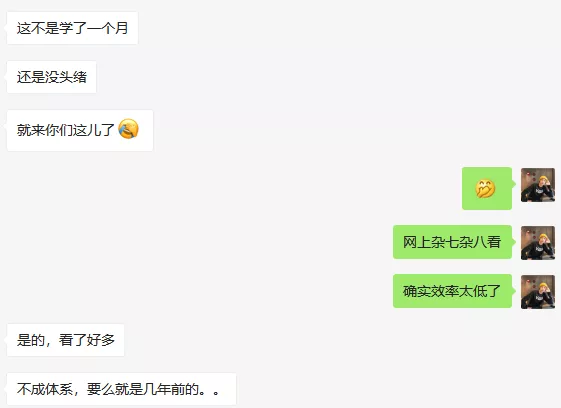 转行之前,我心里想着先沉下心来自学,于是风风火火地自学了1个月,我发现自己找不到学习重点,如同一只无头苍蝇一样,东学一点西学一点,这种不成体系的学习方式让我焦虑不已,学完就忘。加之这段时间没有新的面试通知,我就更加郁闷了。