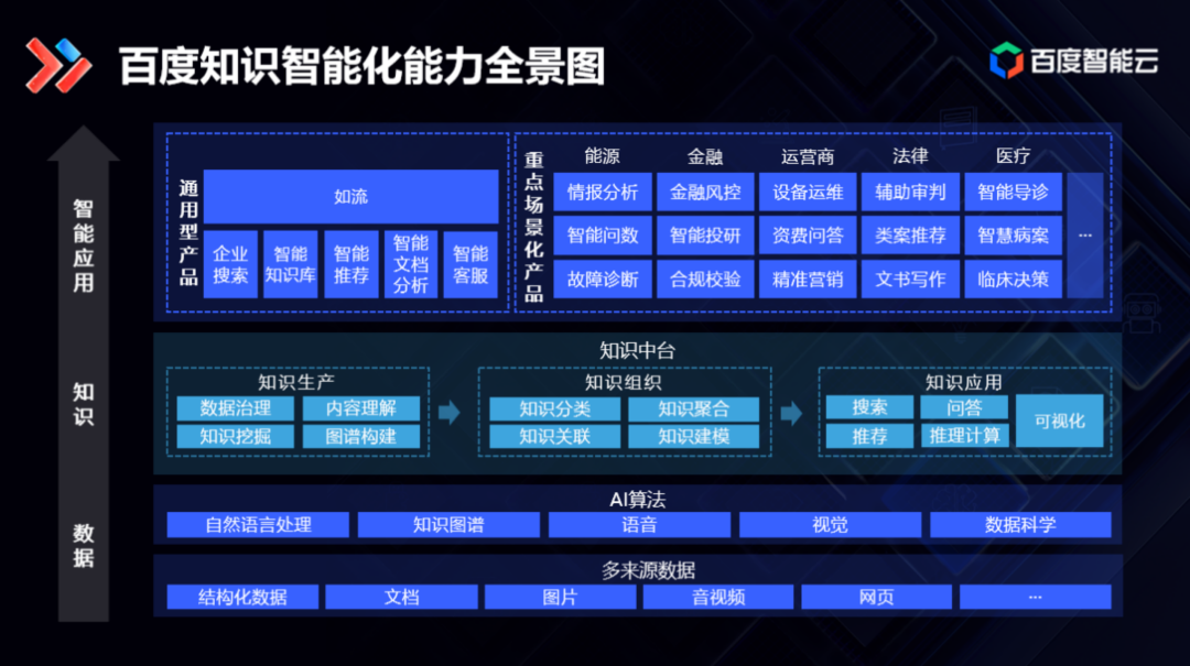 12 月 17 日,百度智能云举办的“云智技术论坛”知识智能化专场中给出了答案。其中百度技术委员会主席吴华在开场致辞中提到:“知识是企业管理者和员工做出业务决策的重要依据,企业急需建立全新的信息和知识处理平台,以智能化的手段推动数据转换为知识,支撑企业创新业务的快速落地和迭代。”