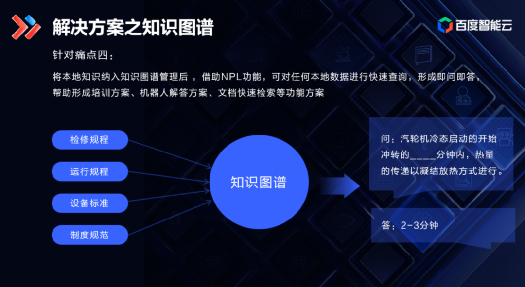 现在,百度的知识中台已在能源、金融、风控、医疗、法律、电信运营等领域进行了丰富的实践和探索落地。本次论坛还远程连线了国能(绥中)发电有限责任公司的信息高级主管包晓明,带来了知识智能化助力能源企业的生产经营转型的分享。分享中包晓明梳理了电力生产中的五大痛点: