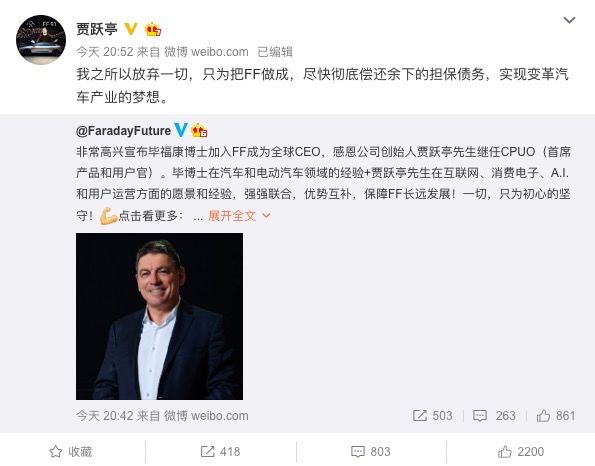 贾跃亭辞去法拉第未来CEO,原拜腾CEO毕福康接任
