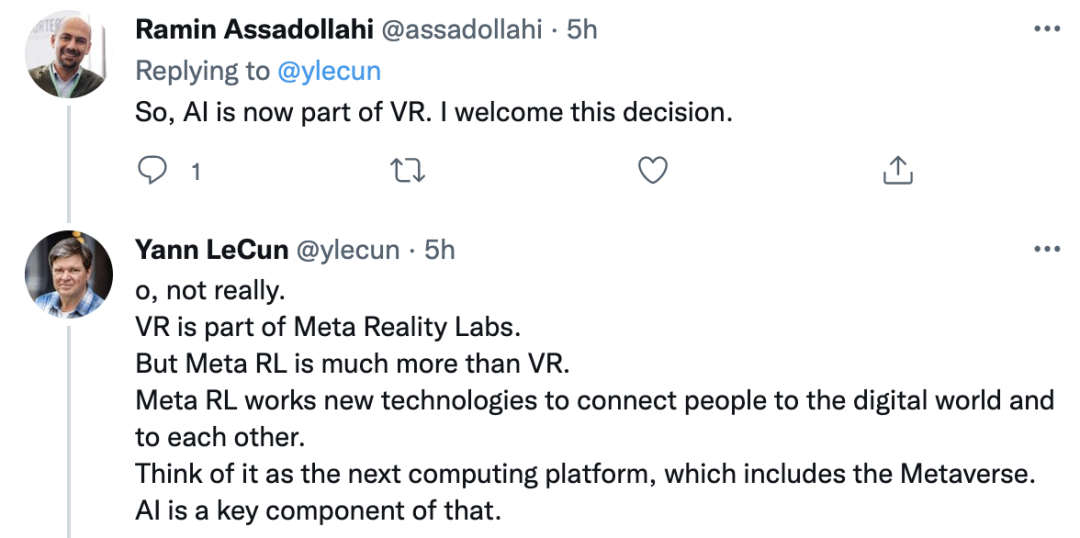 也就是说,LeCun领导的人工智能研究团队将迁至Andrew Bosworth领导的Reality Labs,以便进一步整合AR/VR部门的资源。