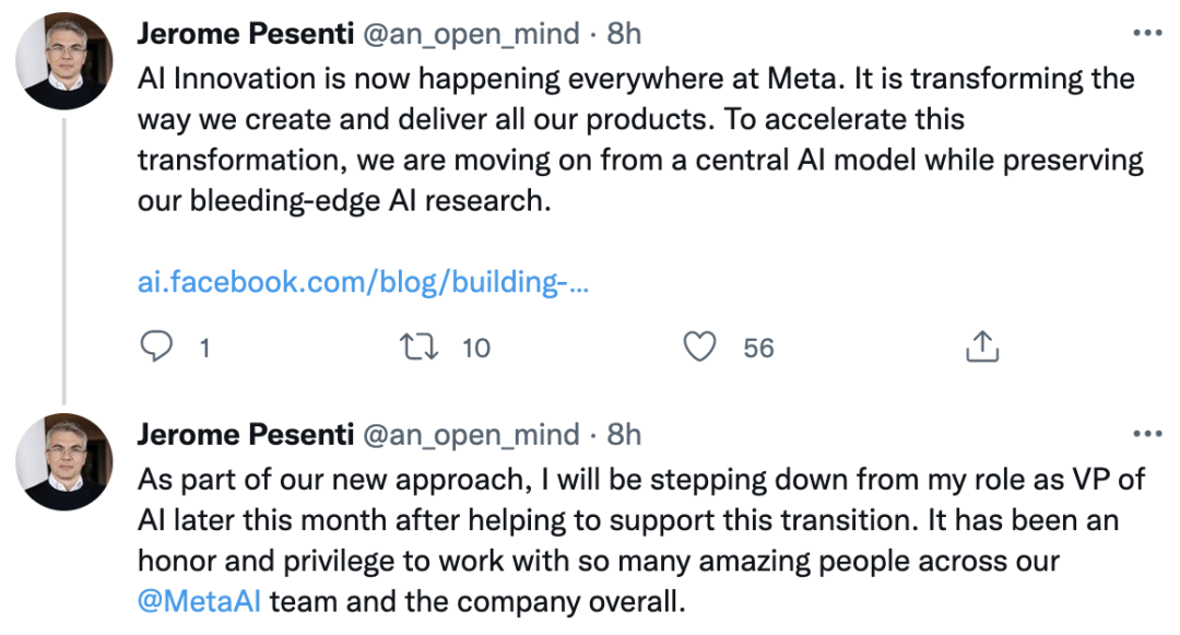 同在今天,Jerome Pesenti在个人推特上官宣:即将离开Meta。