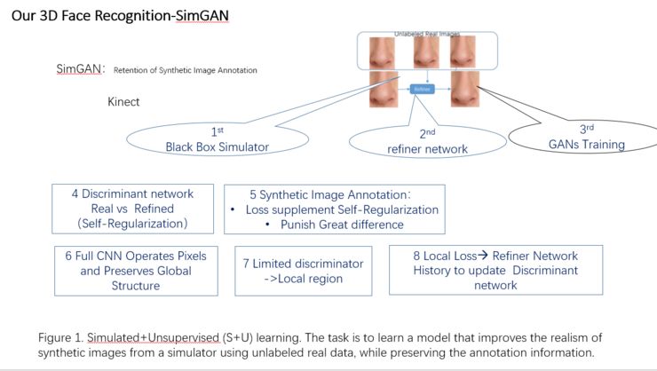 三维建模方式另一个主要关键是三维人脸库的问题,现在大容量带标注的三维人脸库非常少,我们团队最近几年尝试使用S+U方法进行三维人脸库重建及图像自标注研究,人脸方面当然这些前提是有获得RGBD等基素,并具备了三维重建模型基础进行的。
