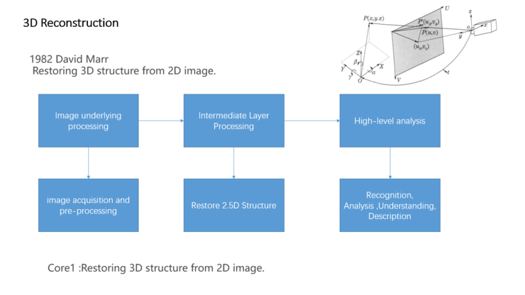 从光学的角度来说,采集到基素及要素信息之后,如何进行快速计算,然后再用三维场景重建,现在所有的方法都是2维变成2.5维。David Marr提到的方式,也是二维到二点五维到三维。在这个过程中大家用了很多方法包括几何方法、统计学方法及点云等进行三维重建,其实没有太多大的进展。