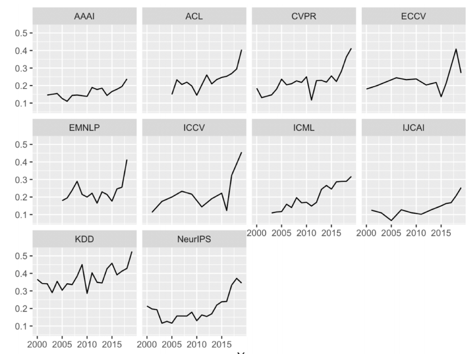 自深度学习兴起以来,QS 301-500的大学在顶会中的论文平均减少了六篇,比预期少了25%。