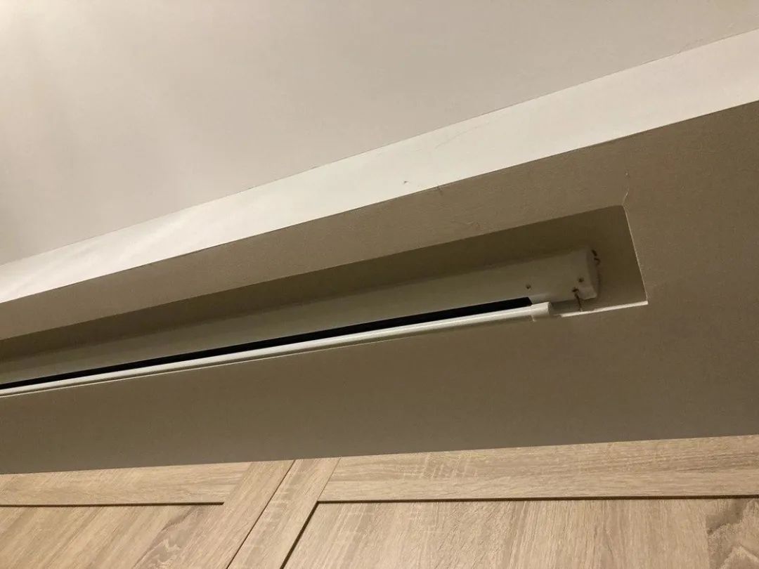 我又双叒叕是从成本角度出发,选择了最最普通的电动幕布,并且在做客厅装修吊顶设计的时候就专门嘱咐设计师设计了安装幕布的槽,所以幕布顶部的电机部分就可以隐藏在吊顶槽内,幕布收起来后基本看不到幕布的存在,干净清爽。我这款的安装件是两个挂圈,需要把配的带钩自攻螺丝拧到吊顶的木板中,开始还担心承重不够,但是实际使用下来并没有什么问题。