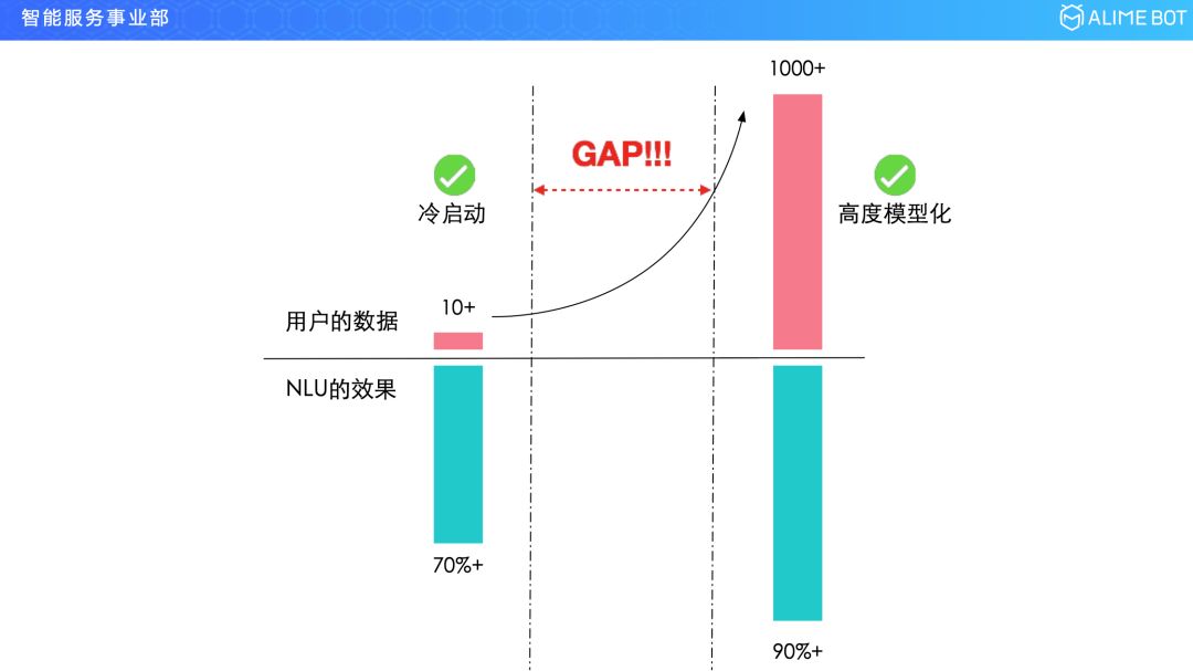 在冷启动阶段,用户在录入样本的时候,不会录入太多,可能录入十几条几十条就已经很多了,这个时候按照刚才那个幂律分布,二八原则的话,它的效果的话可能也就是 70% 多,它不可能再高了。但对于用户的期望来说,如果想要上线,想要很好的满足他的用户需求,其实是想要模型效果在 90% 以上,如果想要达到这个效果,就需要复杂的模型,需要标注大量数据。所以其实是存在一个 gap 的,我们引入了迁移学习模型。
