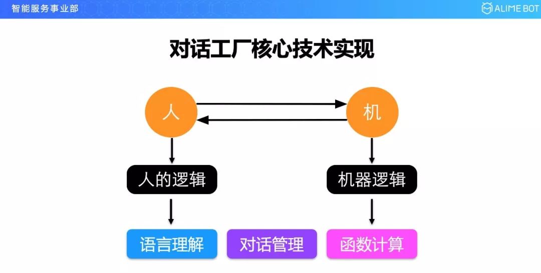 对话工厂首先是用来做对话的,人机对话有两个主体,一个是人,一个是机器,人有人的逻辑,人的逻辑使用什么来表达呢?到今天为止主要还是通过语言,所以我们需要有一个语言理解的服务来承载这一块;机器有机器的逻辑,机器的逻辑到今天为止还是通过代码来表达的,所以我们需要一个函数计算的服务;在人和机器对话的过程中,这种对话过程需要有效的管理,所以我们需要一个对话管理模块。整个对话工厂最核心的三个模块就是语言理解、对话管理和函数计算。