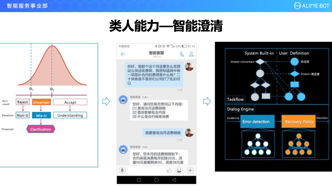 第二个我们看一下澄清,用户说的一句话里面,如果是模糊不清的怎么办?我们通过大量的数据分析发现这种模糊不清主要出现在两种情况下,一种是用户把多个意图杂糅在一段话里来表达;第二种是用户在表达一个意图之前做了很长的铺垫,对于这两种长句子现在的语言理解给出的是意图的概率分布,我们把这个概率分布放到对话管理模块以后就需要让用户进行一轮澄清。比如这个例子,这是移动领域的一个例子,这句话理解有三种意图,到底是想问花费明细,还是套餐的事情还是想问合约的低保,把这三个问题抛给用户进行澄清就可以了。