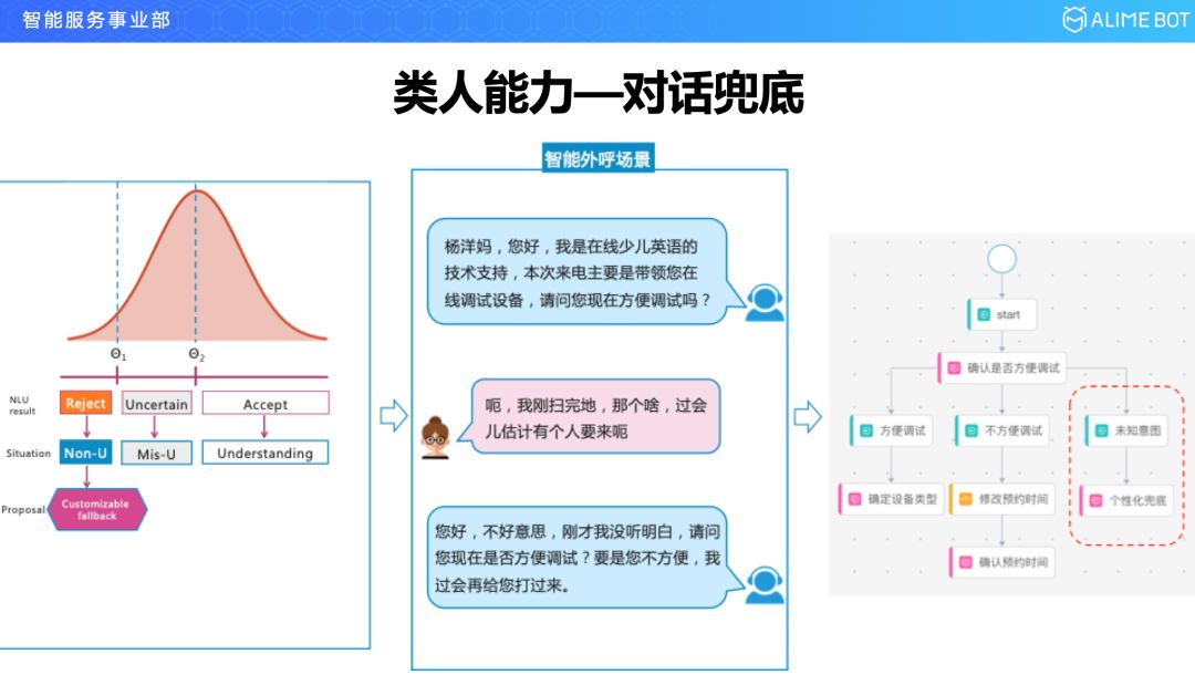 对于拒识这块,比如还是在线英语的这个例子,机器人打来一个电话,问现在方不方便调试设备,这个时候从设计的角度来说希望用户回答方便或者不方便就OK了,但是一旦这个用户回答了一个比较个性化的话,比如,“呃,我刚扫完地,过会儿可能有人要来”,这时候我们的语言理解模块很难捕捉到这是什么语义,这时候需要引入一个个性化的拒识,比如说,“您好,不好意思,刚才没听明白,请问您现在是否方便调试,如果您不方便,我过会儿再给您打过来”,这个就是对话的兜底,是对 unknown 的处理。