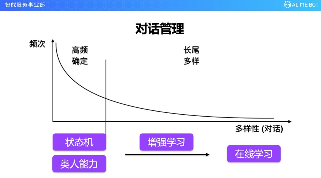 举一个例子,比如像查天气这样的,如果采集十万个查天气的样本,对这些用户的说法进行一个频率统计的话,大概就是这样一个曲线,用两步能够完成的,比如说查天气,先填槽一个时间再填槽一个地点,然后返回一个结果,通过这种流程来完成的,可能有两万次;中间可能会引入一些问 A 答 B 的情况,这样的 B 可能有各种各样的,就跑到长尾上来了,这样整个对话其实也遵循一个幂律分布。