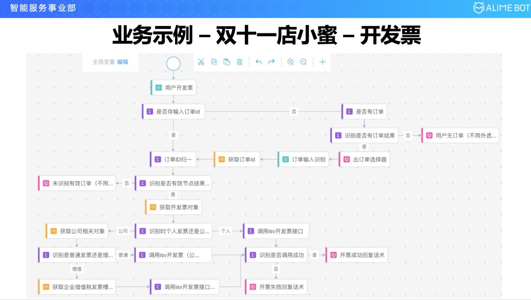 店小蜜主要是一些开发票、催发货、改地址这样的流程,这里是一个开发票的例子,用户可能会先说一个开发票,进来以后要进行复杂的流程,一种是在说的时候其实他已经把它的订单号送进来了,如果没有说订单号的话需要去后台系统查订单号,查出来以后弹一个订单选择器选择订单,接下来如果是个人发票就走这个流程,如果是公司发票走另一个流程,接下来会问是普通发票还是增值税发票,如果是普通发票接着往这儿走,如果是增值税发票需要获取企业增值税的税号,最后汇总到一个节点,调用后台开发票的系统,把发票开出来。这是这次双十一里面用到的开发票的一个例子。