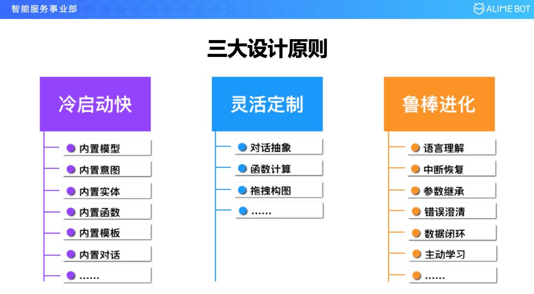 这三个原则里面,冷启动这一块,其实就是要把用户用到的各种能力和各种数据都尽量变成一种预置的能力,简单来说就是平台方做得越多,用户就做得越少;第二块关于灵活定制,就要求我们把整个对话平台的基础元素进行高度抽象,你抽象的越好就意味着你平台的适应能力越好,就像是经典力学只要三条定律就够了;第三块就是鲁棒进化,这一块就是要在模型和算法上做深度了,语言理解的模型,对话管理的模型,数据闭环,主动学习,在这些方面能够做出深度来。