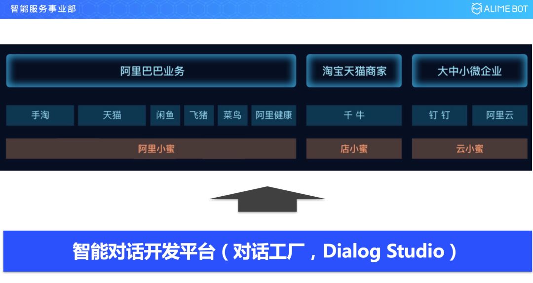所有的这些场景落地到我们小蜜家族的时候,是通过刚刚介绍过的三大小蜜来承载:阿里小蜜、店小蜜和云小蜜。我们不可能给每一个行业里面的每一个场景去定制一个对话流程,所以我们就沿用了阿里巴巴一贯做平台的思路,这也是我们整个智能对话开发平台的由来。这款产品在内部的名字叫对话工厂(Dialog Studio)。