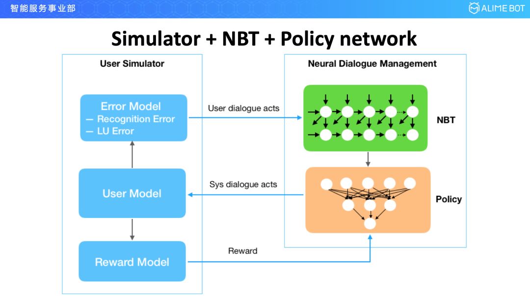 再看一下我们在增强学习方面的工作。在对话管理模型里面,经典的分成两个模块,一个是 neural belief tracker,用来做对话状态追踪的,另一个是 policy network,用来做行为决策的。在整个框架下,要去训练这个网络的时候,有两种训练方式,一种是端到端的去训练,用增强学习去训练,但这种方式一般它的收敛速度会比较慢,训练出的结果也不好;另外一种方式是先分别做预训练,这个时候用监督学习训练就好了,不用增强学习训练,训练完以后再用增强学习对监督学习预训练的模型进行调优就可以了。