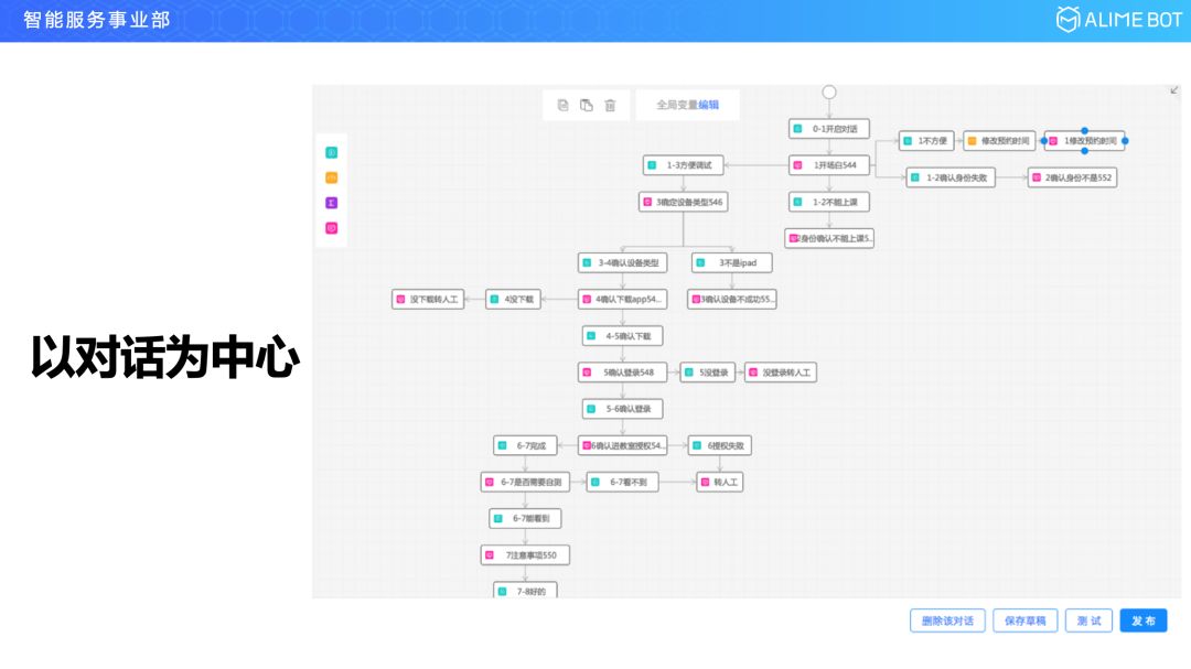 我们在这次对话工厂的设计中彻底把它扭转回来,对话就是要以对话为中心,你在我们的产品界面里面看到的不再是一个个孤立的意图,而是关联在一起的、有业务逻辑关系的对话流程。以意图为中心的设计中,你看到的其实是一个局部视角,就只能实现一些简单的任务,比如控制一个灯,讲个笑话,或者查个天气,如果你想实现一个复杂的任务,比如开一个发票,或者去 10086 里开通一个套餐,它其实是较难实现,很难维护的。我们把整个理念转换一下,回到以对话为中心以后,就会看到全局视野,可以去做复杂的任务,可以去做无限的场景。