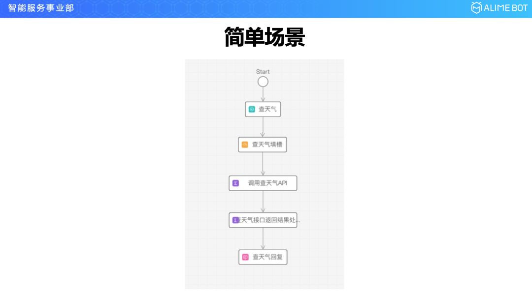 举两个例子,先看一个简单的,你要查一个天气,很简单,先来一个触发节点,把天气流程触发起来,中间有两个函数节点,一个是调中央气象台的接口,把结果拿过来,另一个是对结果进行一次解析和封装,以一个用户可读的形式通过回复节点回复给用户。这里面稍微解释一下就是增加了一个填槽节点,填槽节点是什么意思呢?就是在任务型对话里面,几乎所有的任务都需要收集用户的信息,比如你要查天气,就需要问时间是哪一天的,地点是什么地方的,这样就叫做填槽,填槽因为太常用太普遍了,就符合我们冷启动快里面做预置的思想,所以通过三个基础节点,我们自己把它搭建成填槽的一个模板,需要填槽的时候从页面上拖一个填槽节点出来就可以了。