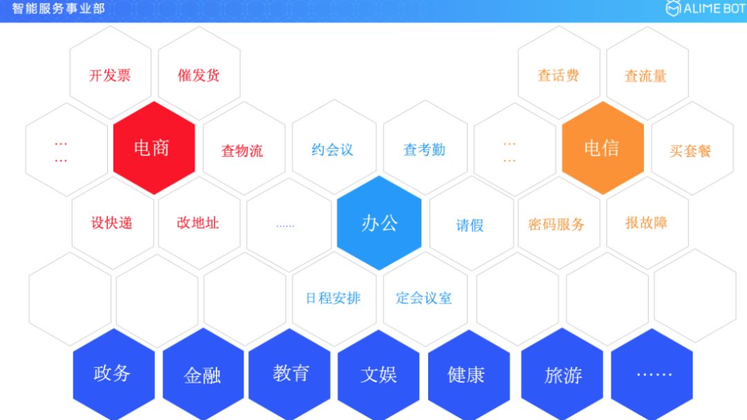 如果我们把视野再放大一点的话,再看一下电商行业,电商行业里面就会涉及到开发票、催发货、查物流、改地址、收快递等等,也会涉及到很多很多的这样的任务型对话场景;视野再放大一下,我们再看一下电信行业或者整个运营商的行业里面,会有查话费、查流量、买套餐、报故障或者是进行密码的更改服务等,也会有大量的这种任务型的对话场景。如果我们再一步去看的话,像政务、金融、教育、文娱、健康、旅游等,在各行各业的各种场景里面我们都会发现这种任务型的对话,它是一种刚需,是一种普遍性的存在。