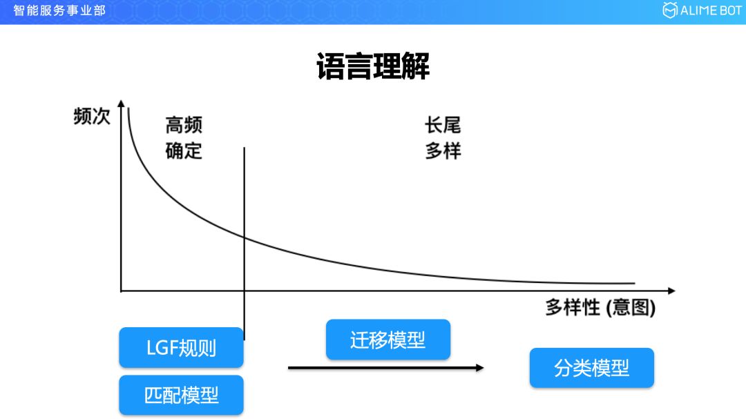 我们先看一下这个图,在整个这个图里面,横轴是意图的多样性,纵轴是频次,这样说有点抽象,我举一个具体的例子,比如说我要开发票,这是一个意图,如果去采样十万条这个意图的用户说法作为样本,把这些说法做一个频率统计,可能排在第一位的就是三个字“开发票”,它可能出现了两万次,另外排在第二位可能是“开张发票”,它可能出现了八千次,这些都是一些高频的说法,还有一些说法说的很长,比如“昨天我在你们商铺买了一条红色的裙子,你帮我开个发票呗”,这种带着前因后果的句式,在整个说法里面是比较长尾的,可能只出现了一次或两次。