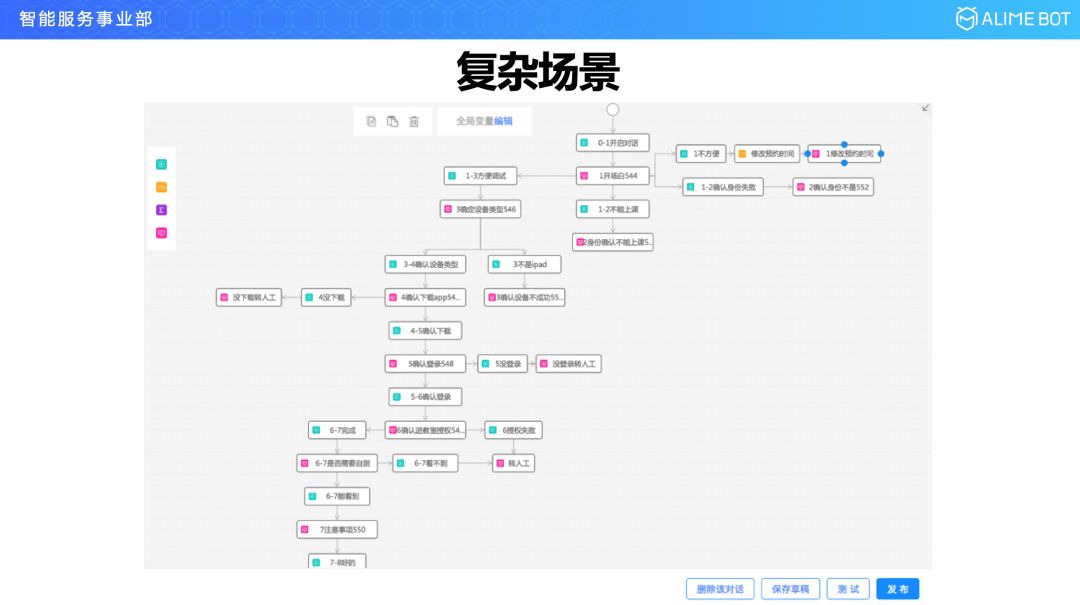 我们再看一个复杂的场景,这是在线教育里面的一个外呼场景,家里有小孩的可能知道,这种在线教育特别火,在上课之前半小时,机器人就会主动给用户打电话,指导软件下载,指导怎么登陆,登陆进去以后怎么进入教室,所有的这些流程都可以通过机器人进行引导。