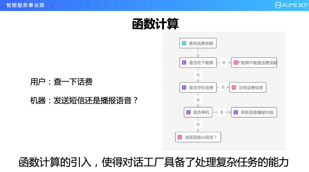 函数计算是什么东西呢?还是举一个例子吧,比如说,10086 里面用户说要查一下话费,10086 那边的机器人就会回复一句是发短信还是播放语音,表面看来就是简单的一入一出,其实在这背后要经过多轮的服务查询,才能完成这个结果,因为当要查话费的时候,先要经过函数计算查一下现在是哪一天,如果是下账期的话是不能查话费的,就是每个月的最后一天不能查话费,如果可以查话费的话,先看一下用户是否存在话费,如果存在花费的话第三步调用的服务看是不是停机了,因为停机了的话只能语音播报不能接收短信。所以看一下在一个简单的一入一出的对话背后,是走了一个复杂的流程的,这些流程今天都是在机器端用代码来实现的。函数计算的引入,使对话工厂可以去处理复杂的任务。