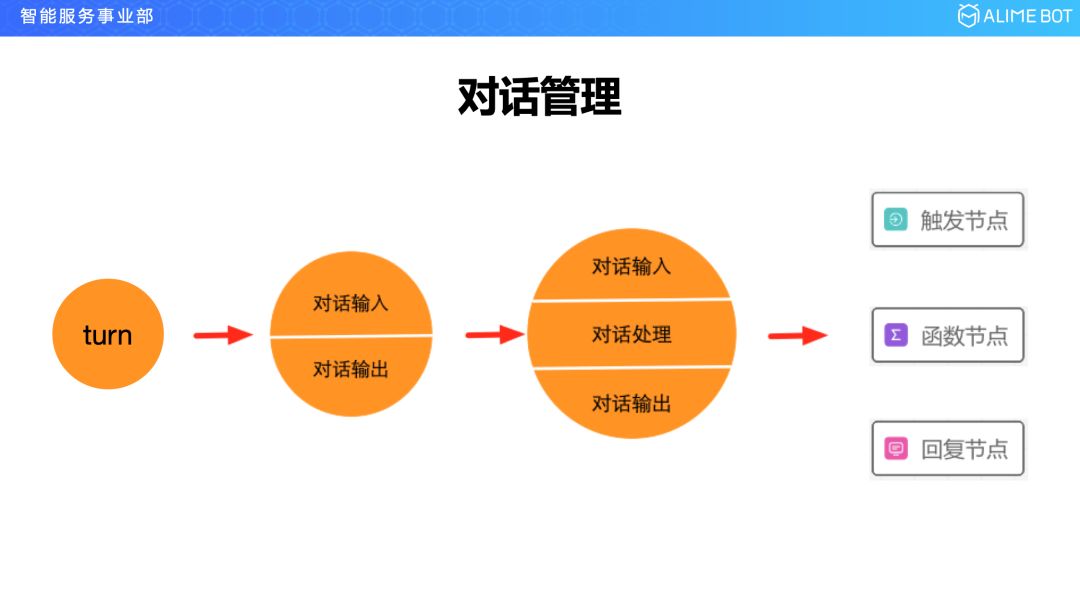 对话管理其实我刚刚也说过了,如果想要让平台有足够的适应性的话,那么它的抽象能力一定要好。对话管理是做什么的?对话管理就是管理对话的,那么对话是什么呢?对话的最小单位就是一轮,一个 turn,我们进去看的话,一个 turn 又分为两部分,一个叫对话输入,一个叫对话输出;在输入和输出中间,有一个对话处理的过程,就像两个人互相交流一样,我问你答,但其实你在答之前是有一个思考过程的,如果你不思考就回答,那你的答案就是没有质量的,所以就会有一个中间的对话处理过程。