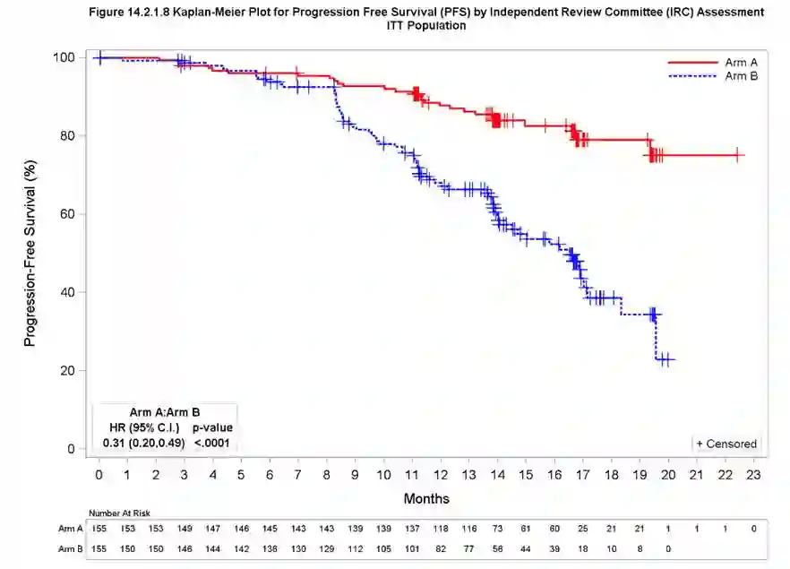 3.Acalabrutinib组的PFS中位时间尚未达到,而对照组为16.5个月;