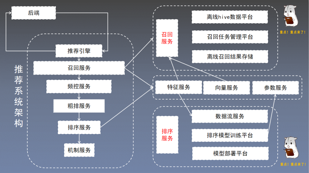 推荐系统架构中,包括推荐引擎、召回服务、频控服务、粗排服务、排序服务、机制服务。