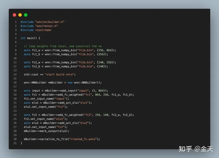 我在做这套IR的时候,猛然发现它的功效其实还可以做很多事情,不仅仅是学习,甚至可以完成一些工业落地的东西。介绍一种模型部署新思路:我们有没有一种可能,直接用推理框架来构建模型?答案是完全可以的。直接上代码: