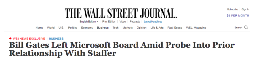 据此前《华尔街日报》报道,2019年一名微软员工关于她与盖茨先生过去的风流韵事的信导致一些董事会成员对此事进行调查。