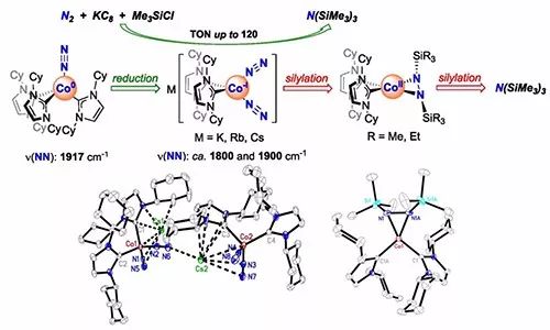研究发现,零价钴分子氮配合物[(ICy)3Co(0)(N2)]经碱金属还原可以得到负一价钴双(分子氮)配合物M[(ICy)2Co(-1)(N2)2](M = K,Rb,Cs)。这些负一价钴双(分子氮)配合物中的氮气分子在质子酸的作用下可以部分选择性地转化为肼,产率为24%-30%(相对于钴);与R3SiCl(R = Me,Et)反应,可以实现氮气分子的1,2-二硅化,形成钴二氮烯配合物[(ICy)2Co(II)(ƞ2-R3SiNNSiR3)],这是首例由氮气分子官能化直接制备的后过渡金属二氮烯类配合物。在还原剂KC8和Me3SiCl存在下,配合物[(ICy)2Co(II)(ƞ2-Me3SiNNSiMe3)]中的含氮基团可以高产率地转化为N(SiMe3)3。在此基础上,课题组进一步发展了氮杂环卡宾钴配合物催化的氮气分子的还原硅化反应,TON值达120,超过了目前已报道的3d金属催化体系。该研究拓展了后过渡金属在氮气活化转化方面的应用,对新的后过渡金属催化体系的设计具有指导意义。