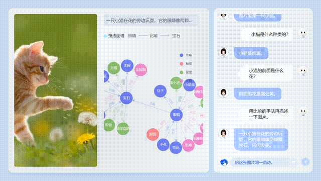 你还可以要求AI用比喻的手法描述一下这张图片,AI会回答:一只小猫在花的旁边玩耍,他的眼睛像两颗黑宝石,闪闪发亮。