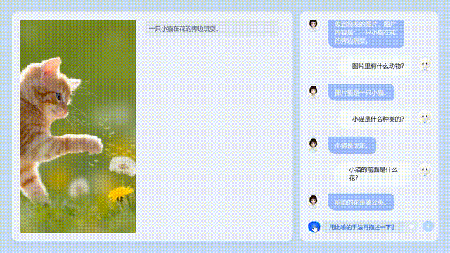 比如,在AI收到这张图片后,就会自动回答:图片内容是一只小猫在花的旁边玩耍。然后还能答出小猫的种类、小猫旁边是什么花。