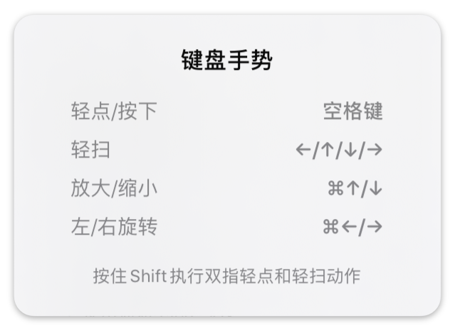 在「键盘手势」模式里,你的方向键也变成了朝四个方向滑动屏幕的手势。而 Command + 方向键则对应着放大缩小以及旋转的操作。如果你想要用双指点按或滑动屏幕,只需要按住 Shift 键,再点击空格或方向键即可。