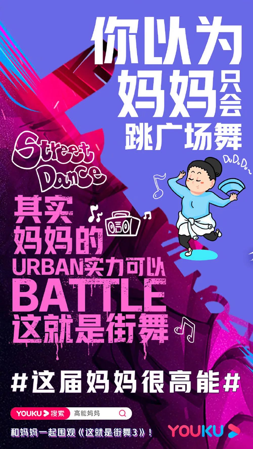 母亲只是一个身份,她也有自己的兴趣爱好。优酷以“这届妈妈很高能”为主题的系列海报让我们抛开偏见,尊重、认识了妈妈的另一面。同时,优酷也借势宣传了《这就是街舞》节目。