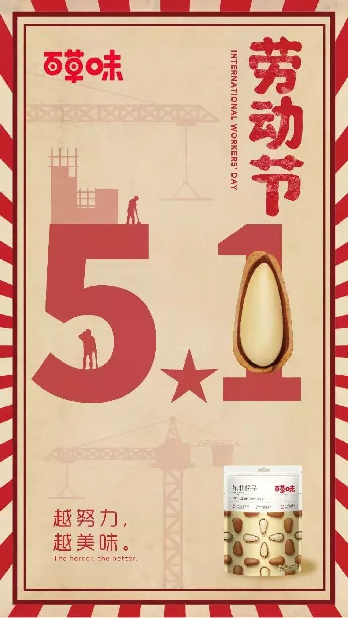 百草味把劳动者的精神特质与品牌名称相结合,“越努力,越美味”一语双关。