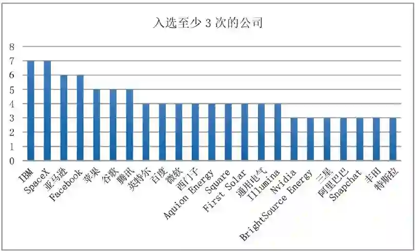 在 2011 年到 2017 年的 7 年时间里,共有 195 家公司入选 TR50 的榜单,其中有 63 家公司至少入选了 2 次,23 家公司至少入选了 3 次。IBM和 SpaceX各入选了 7 次,7 年之间无一缺席。如果把谷歌和 Alphabet 算作一家公司,它也入选了 7 次。亚马逊和 Facebook 各入选了 6 次,在入选次数排名中并列第四。在中国公司中,入选次数最多的是腾讯(Tencent),一共 5 次进入榜单,和苹果并列。