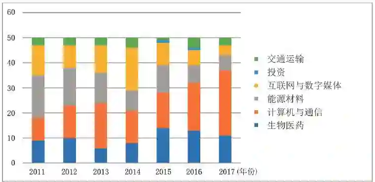 自 2011 年以来,交通运输领域入选的公司数量基本维持在稳定的水平。尼桑、丰田(Toyota)、奥迪(Audi)等汽车制造商,滴滴出行等出行服务公司,甚至是 SpaceX 这样的航天制造和服务提供商,都曾入选。互联网与数字媒体公司的数量在 2014 年达到顶峰后迅速下降,这一趋势符合移动互联网红利结束的时间点。取而代之的是计算机与通信类型的公司数量快速增长。大量新兴人工智能技术公司在 2016 年和 2017 年出现,而亚马逊、苹果、腾讯和百度等老牌互联网公司也纷纷加入人工智能的浪潮。生物医学领域的公司数量也比较稳定,不过子领域却有明显的变化,从早期的制药和基因测序,到后来的基因治疗,再到最近的基因编辑。