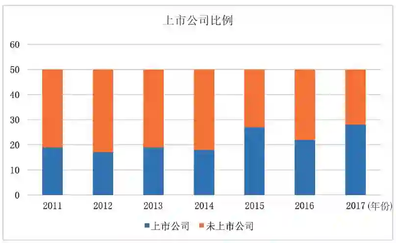 从入选榜单的公司体量来看,从 2011 年到 2014 年,上市公司在榜单中的比例低于 40%。但是从 2015 年开始,上市公司的比例显著增加。在 2017 年的 50 家入选公司中,有 28 家上市公司,占比 56%。这说明,创新可能在向大公司集中。
