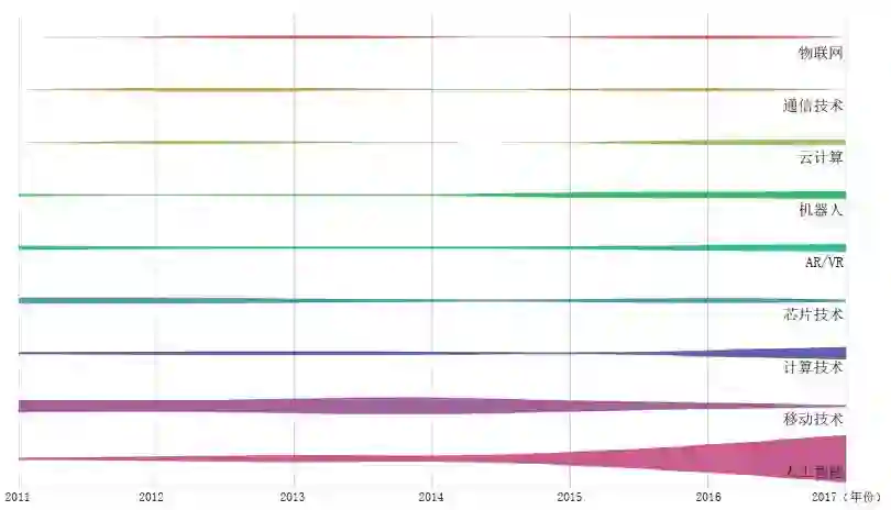 在计算机与通信领域的公司中,最引人注目的变化是人工智能自 2015 年开始崛起。在人工智能领域中,自然语言处理、计算机视觉、语音识别等相关技术都在蓬勃发展。不过,在 2016—2017 年,增长最迅猛的是无人驾驶领域的技术,这一趋势很可能会延续到未来几年。