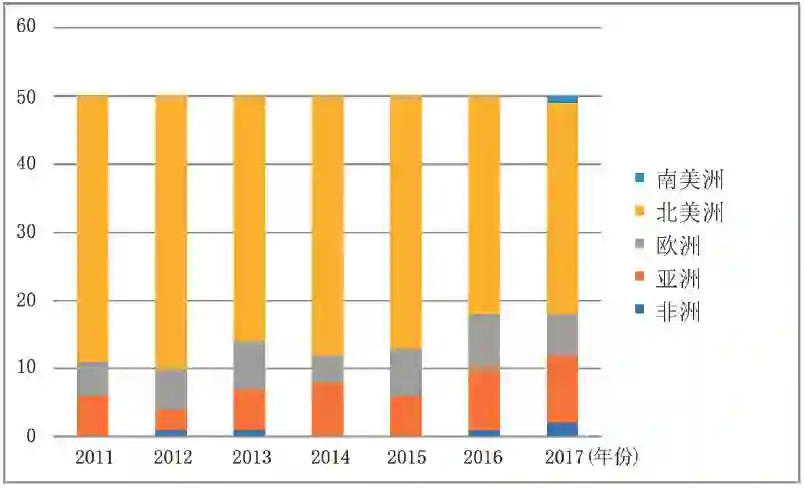 在国家方面,五大洲都有公司入选,虽然比例并不平衡。北美洲依靠美国,占据了榜单的大多数。欧洲和亚洲基本处于旗鼓相当的地位。不过最近两年,得益于中国技术公司的崛起并在世界范围内得到承认,亚洲的公司数已经超过了欧洲。值得一提的是,2017 年,阿根廷电子商务公司 Mercado Libre 首次入选,填补了南美洲的空白。