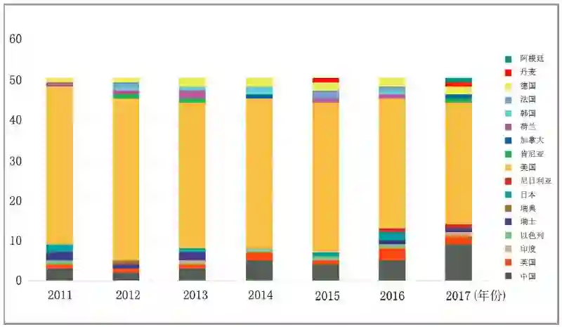 在国家分布上,美国的公司每年都占据榜单的大半,不过优势正在放缓,从名额的 80% 下降到 60%。总体来说,榜单中的国家组成多样性正在增加。中国公司的数量也在显著增加,从 2013 年的 2 家到 2017 年的 9 家。入选的中国公司既包括百度、阿里巴巴(Alibaba)、腾讯、华为(HUAWEI)这样的巨头,也包括小米这样的大型未上市公司,还包括滴滴出行、旷视科技、大疆(DJI)等初创企业。