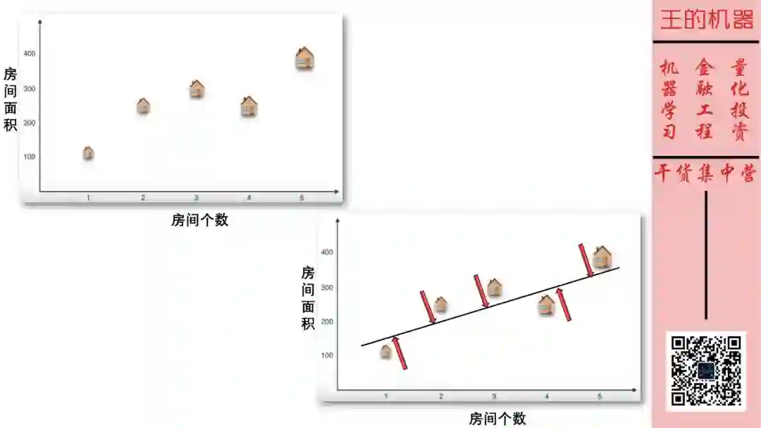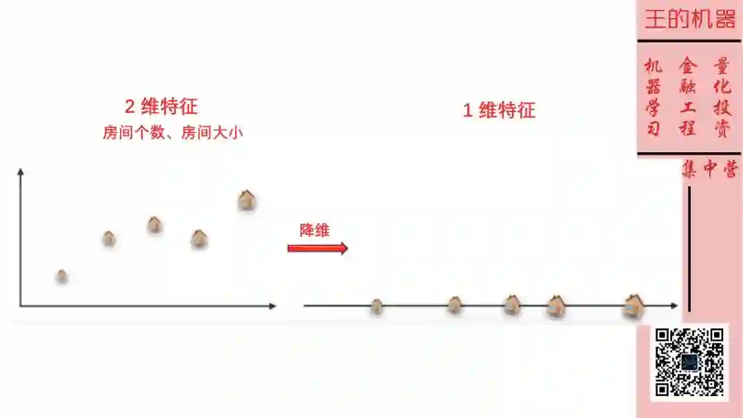 将这 2 维特征实例化为房间面积和房间个数,它们通常成正比关系。假设我们找到一条向上的直线,将这 2 维特征投影到该直线上,如下图。
