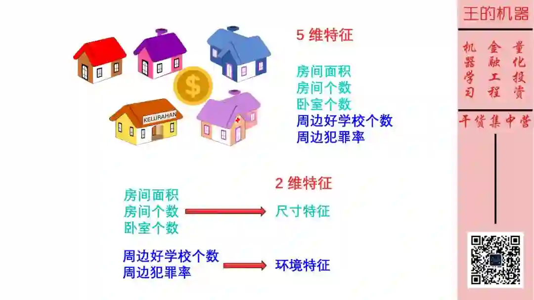 一开始我们有 5 维特征,分别是房间面积、房间个数、卧室个数、周边好学校个数和周边犯罪率。