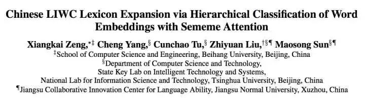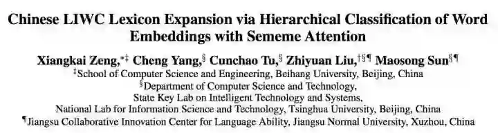 Xiangkai Zeng, Cheng Yang, Cunchao Tu, Zhiyuan Liu, Maosong Sun. Chinese LIWC Lexicon Expansion via Hierarchical Classification of Word Embeddings with Sememe Attention. In AAAI, 2018.