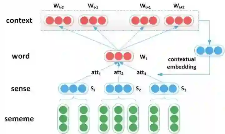 我们考虑将词义的义原知识融入词汇表示学习模型中。在该工作中,我们将HowNet的义原标注信息具象化为如下图所示的word-sense-sememe结构。需要注意的是,为了简化模型,我们没有考虑词义的义原结构信息,即我们将每个词义的义原标注看做一个无序集合。