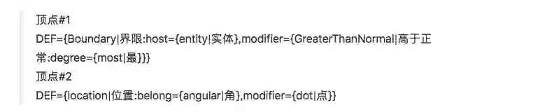例如“顶点”一词在HowNet有两个代表义项,分别标注义原信息如下,其中每个“xx|yy”代表一个义原,“|”左边为英文右边为中文;义原之间还被标注了复杂的语义关系,如host、modifier、belong等,从而能够精确地表示词义的语义信息。