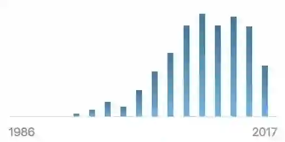 进入深度学习时代,人们发现通过大规模文本数据也能够很好地学习词汇的语义表示。例如以word2vec[4]为代表的词表示学习方法,用低维(一般数百维)、稠密、实值向量来表示每个词汇/词义的语义信息,又称为分布式表示(distributed representation,或embedding),利用大规模文本中的词汇上下文信息自动学习向量表示。我们可以用这些向量方便地计算词汇/词义相似度,能够取得比传统基于语言知识库的方法还好的效果。也正因为如此,近年来无论是HowNet还是WordNet的学术关注度都有显著下降,如以下两图所示。
