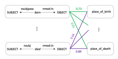 可以看出,表述为born的句子可以被映射到place_of_birth上,虽然训练集中存在错误标签(place_of_death)的问题,但在全局统计的角度看,错误标签占比比较小。因此,全局共现信息可以有效地突出正确标签。