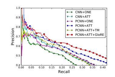 其次,作者用PCNN+ATT+GloRE和一些经典关系抽取数据集进行最终对比: